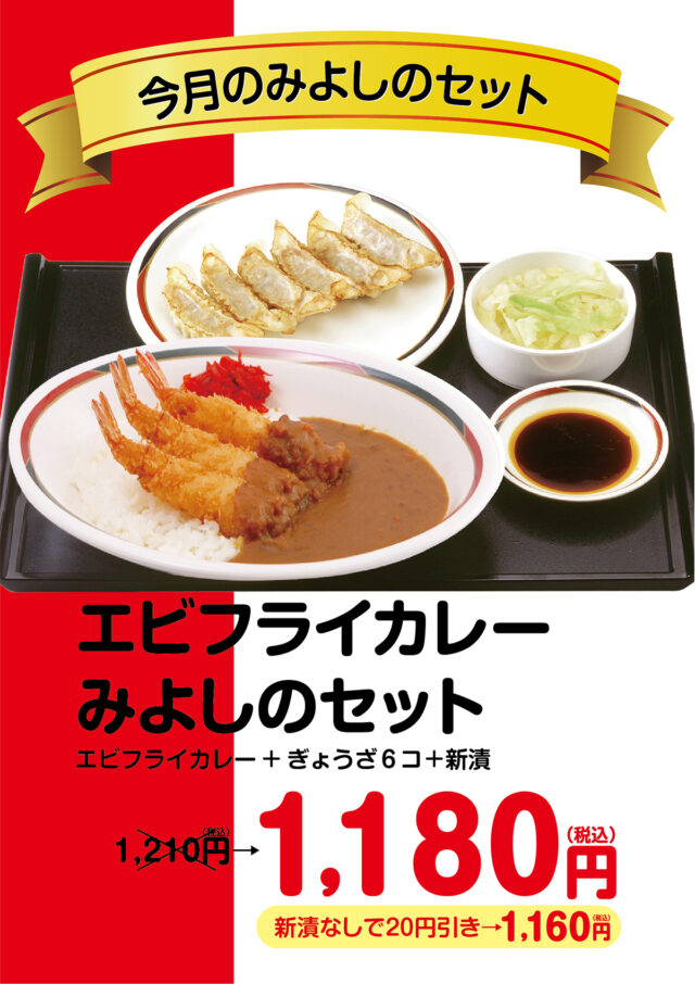 月替わりでお楽しみいただける【今月のみよしのセット】。1月は、サクッと幸せ「エビフライカレー」のお得なセットをご用意! ぜひこの機会にご賞味ください! ※恵庭店・千歳店・苫小牧明野店・旭川大雪通店・旭川永山店は大盛価格が異なります。