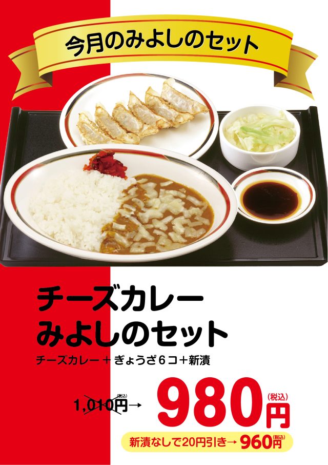 月替わりでお楽しみいただける【今月のみよしのセット】。10月は、みよしの人気メニュー「チーズカレー」のお得なセットをご用意! ぜひこの機会にご賞味ください!