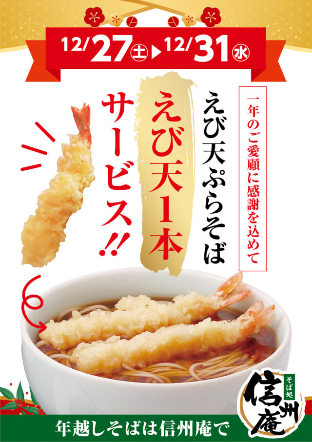 12月27日(土)〜12月31日(水)までの期間限定で、えび天ぷらそばをご注文のお客様にえび天をもう一本サービスいたします。
