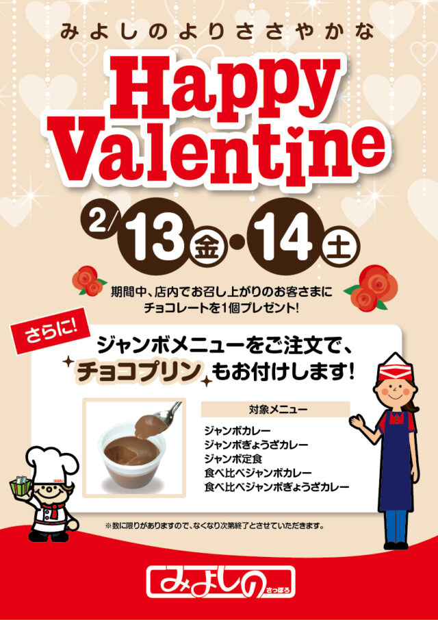 今年のバレンタインは特別企画!期間中、店内でお食事のお客様にチョコレートをプレゼントします。さらに、ジャンボメニューをご注文の方にはチョコプリンもサービス♪