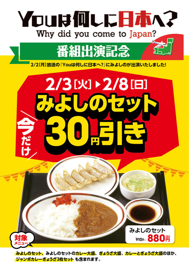 2/2㊊ 番組出演を記念して、放送翌日からみよしのセットを30円引きにてご提供いたします。