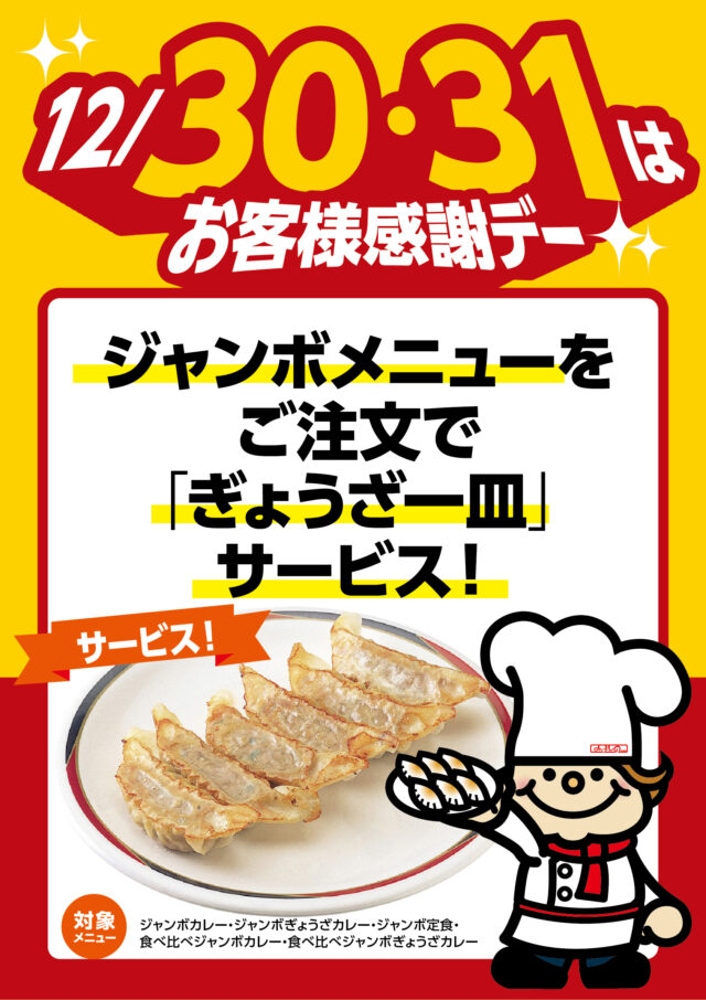 大好評の毎月30日「お客様感謝デー」を今月は31日も実施致します。 ジャンボメニューをご注文いただくと、なんと、ぎょうざ6コが無料でついてきます! 年末の〆はみよしのぎょうざで。【実施店舗】みよしの全店(※営業店舗にて実施)※各店舗の年末年始の営業日・営業時間はこちらから。