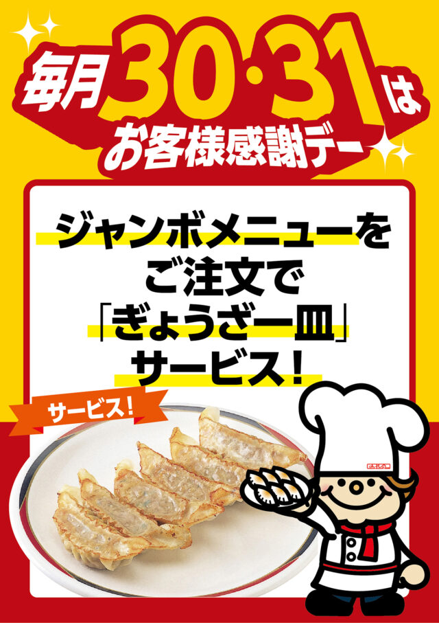 毎月 30日・31日 は『お客様感謝デー』 を実施いたします。 当日は、ジャンボメニュー各種をご注文のお客様に、ぎょうざ一皿をプレゼント!