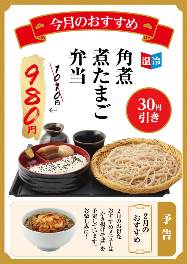 ■『角煮煮たまご弁当』 ■通常価格1,010円→割引価格980円(税込)※1月末まで ■信州庵全店