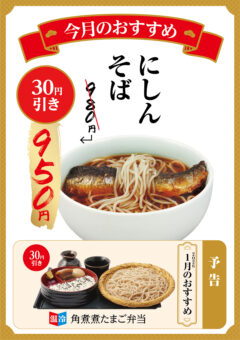 そば処信州庵 冬の定番「にしんそば」。今月はお得にどうぞ。