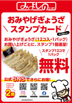スタンプ12個でおみやげぎょうざ1パックが無料になります!